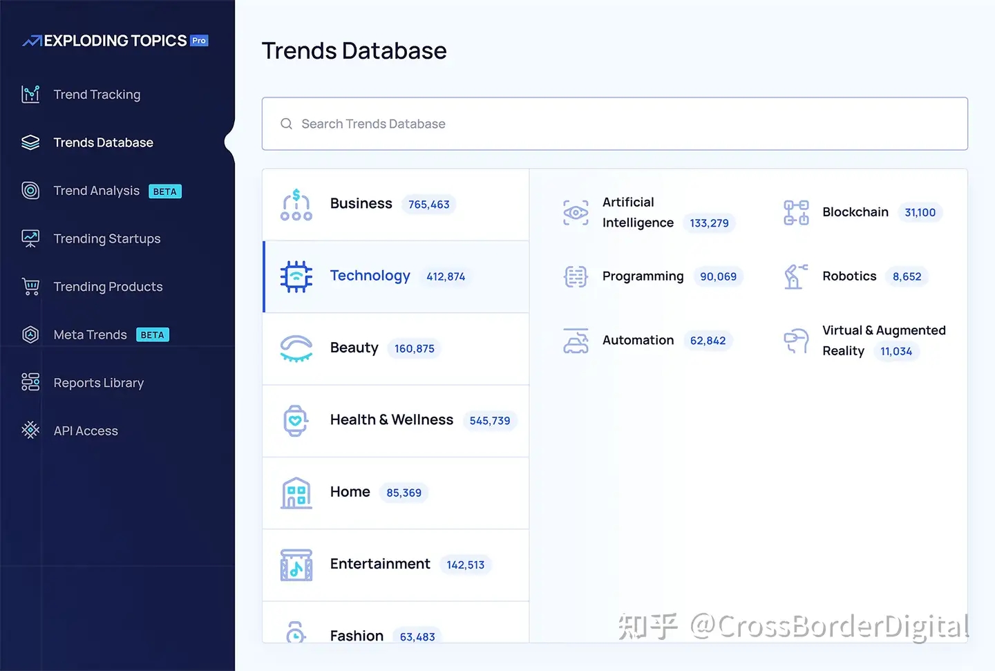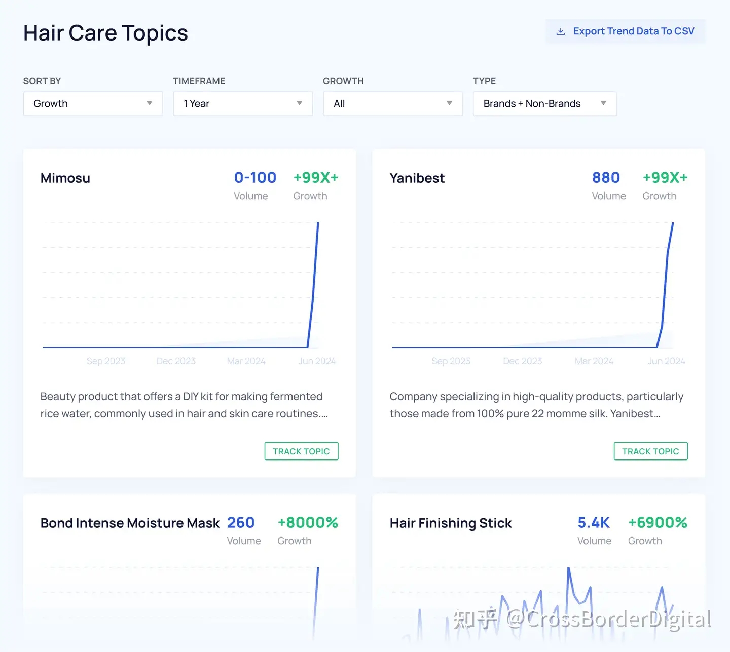 相反,我们建议你使用 Exploding Topics 或 Semrush 等工具对目标关键词进行深入分析。Exploding Topics特别适合查找与你的商店相关的快速增长主题,但需要注册Pro订阅。以下是使用Exploding Topics查找趋势的示例:检查趋势数据库并选择你商店产品所在的行业,比如护发。