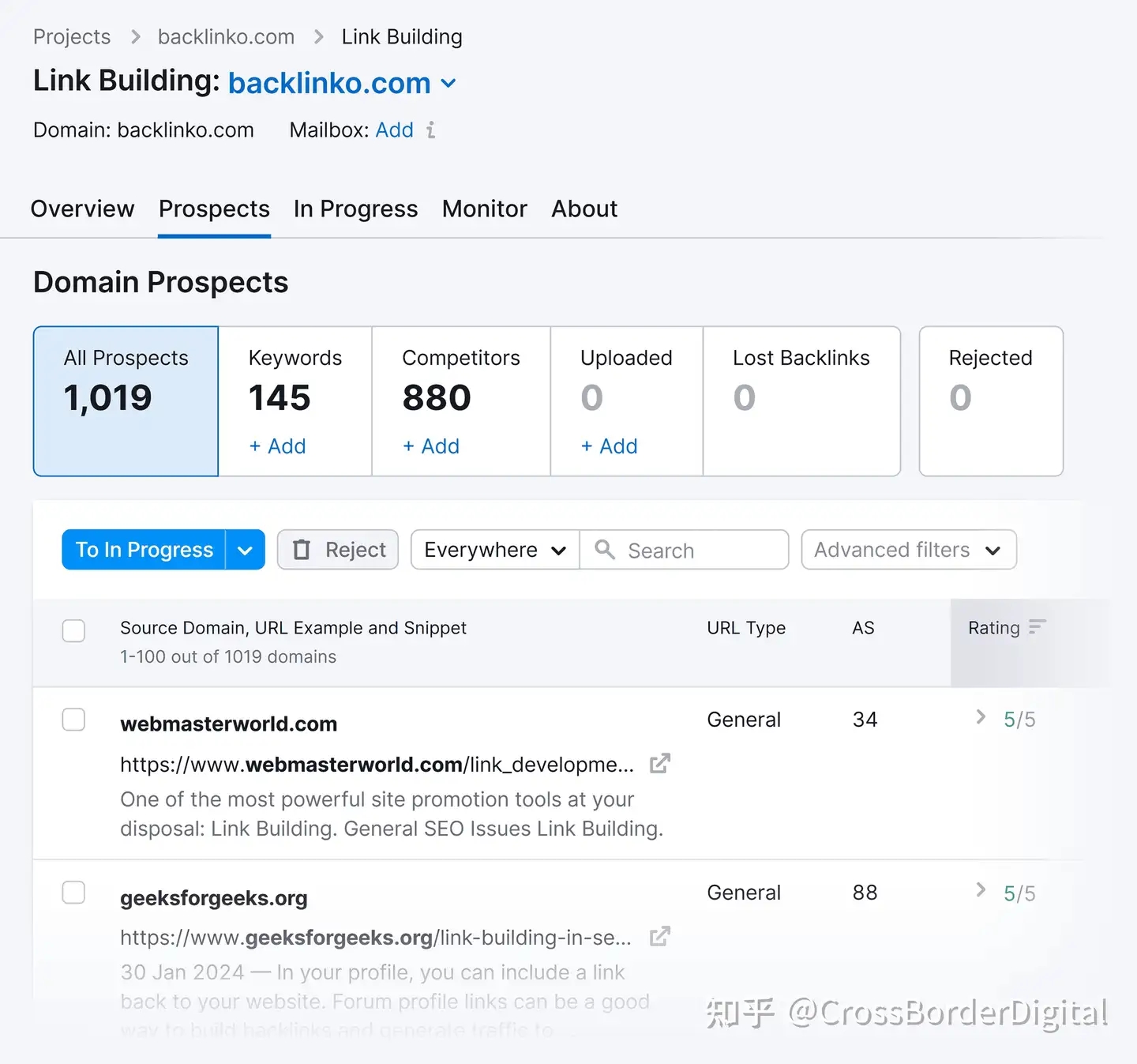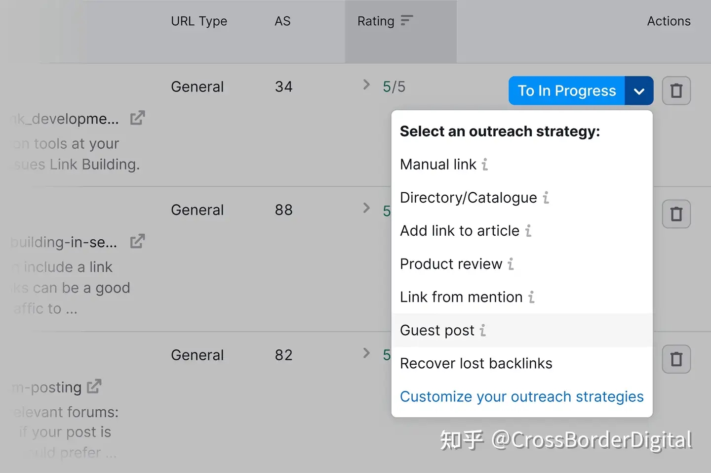 为其他网站撰写文章也可以创造收集链接、建立权威和吸引流量的机会。怎么做?当你在外部网站上创建客座帖子时,请添加一个自然融入内容的链接。使用我们之前提到的链接构建工具来寻找你可以为其撰写涵盖目标关键字的客座帖子的潜在客户。列出竞争对手和目标关键字后,你将有一个要过滤的潜在客户列表。单击“进行中”下拉菜单。在这里,你还可以将潜在客户移动到“客座帖子”列表。