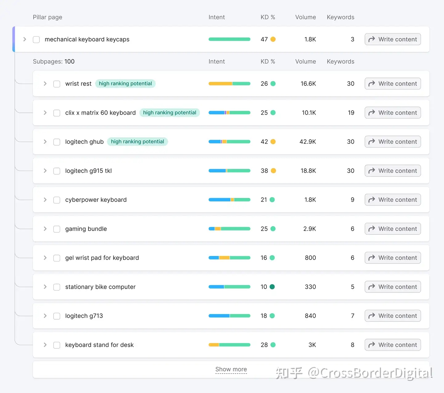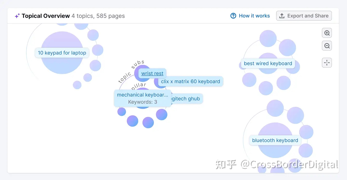 要在Semrush中组织主题分类,可以使用关键字策略生成器来分析单个关键字,并获取包含多个关键字的相关主题分类。例如,如果你输入“键盘”并点击“创建列表”,Semrush会提供一个主题概览,展示不同的次要关键词(如“机械键盘”和“蓝牙键盘”)如何连接在一起,并以聚合页面和子页面的形式呈现。