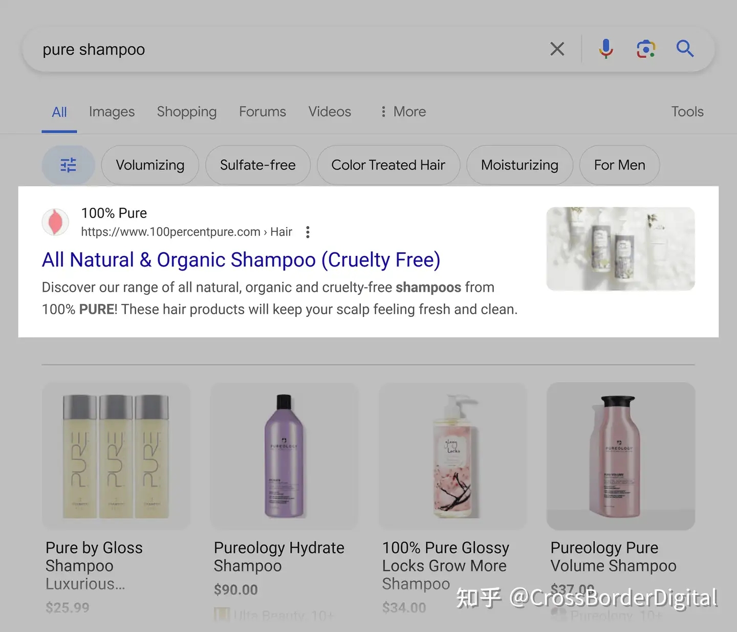 在Google搜索引擎搜索栏里输入“pure shampoo”,其洗发水系列页面就会出现在顶部。