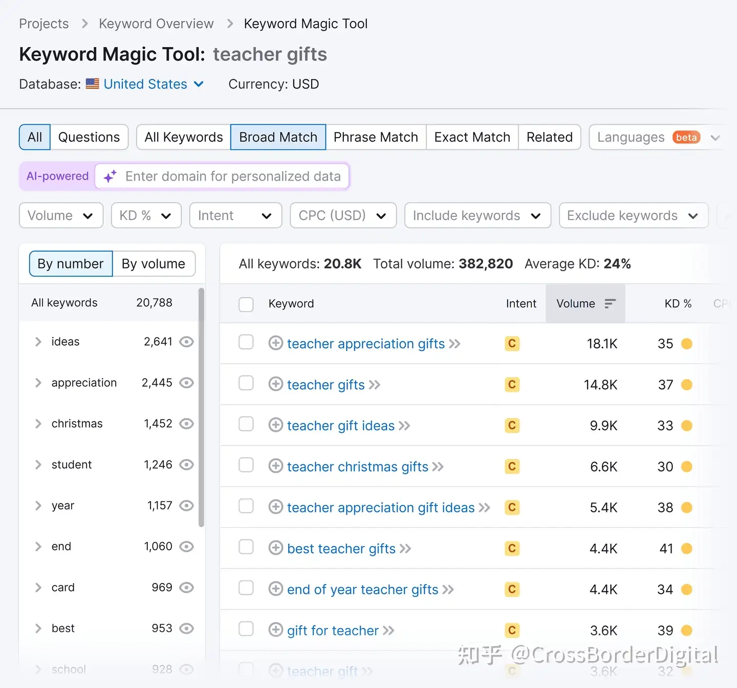 确定关键词的优先级和聚类是关键的一步。创建与你的商店相关的多个关键词列表后,你需要对它们进行分组和优先排序。以下是一些关键指标,例如对于关键词“教师礼物”: