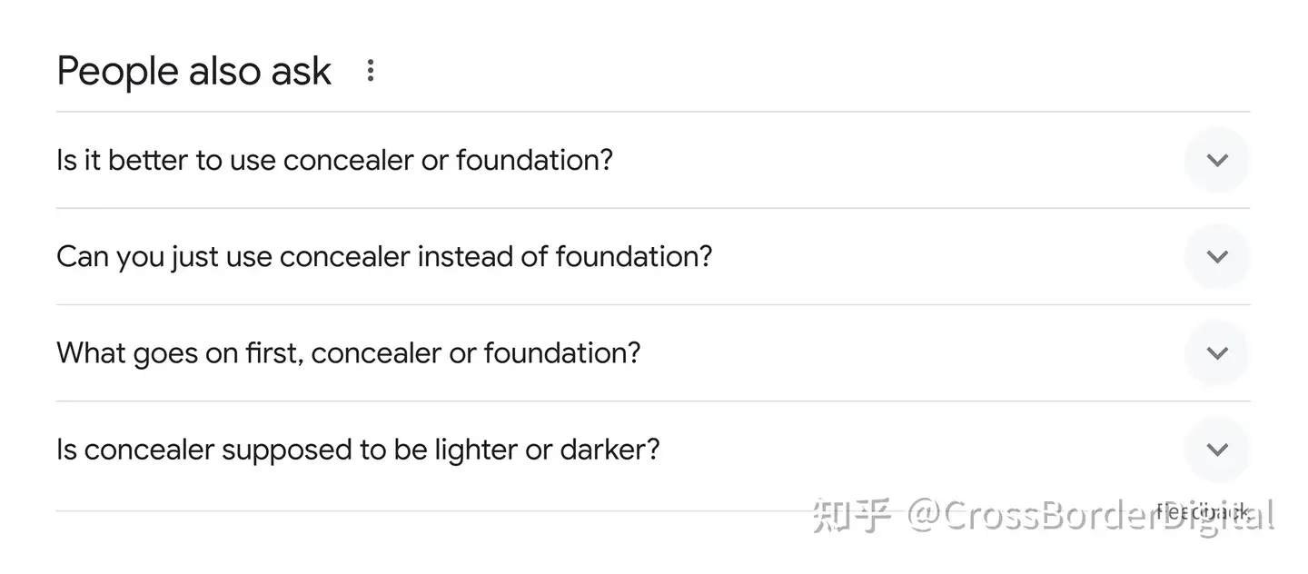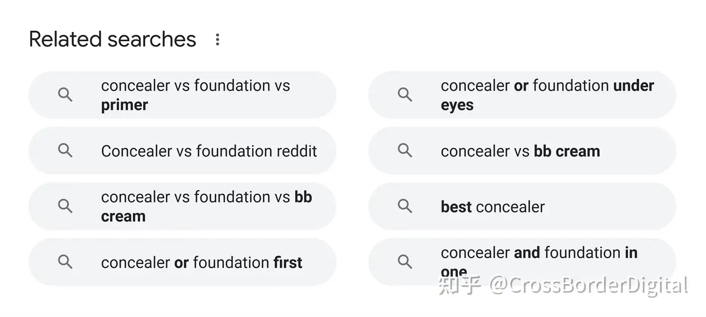 有很多工具可以找到关键词机会。我们将首先向你展示如何手动操作。然后使用像 Semrush 和 Exploding Topics 这样的工具。让我们从一个基本的关键词研究技巧开始:首先使用 Google 搜索与你的商店相关的术语,例如“遮瑕膏与粉底”。然后,浏览搜索结果页底部的“相关搜索”。这些相关搜索项通常会显示与你输入的关键词相关且可能感兴趣的其他搜索查询。