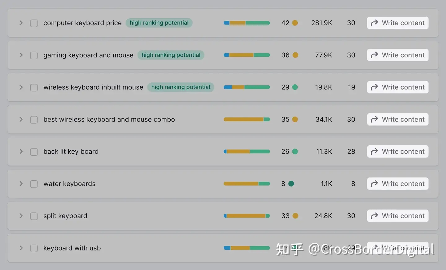 关键字难度 (KD%):衡量关键词的竞争难度,从0到100的范围,数字越低意味着你的内容在该关键词上竞争越小。