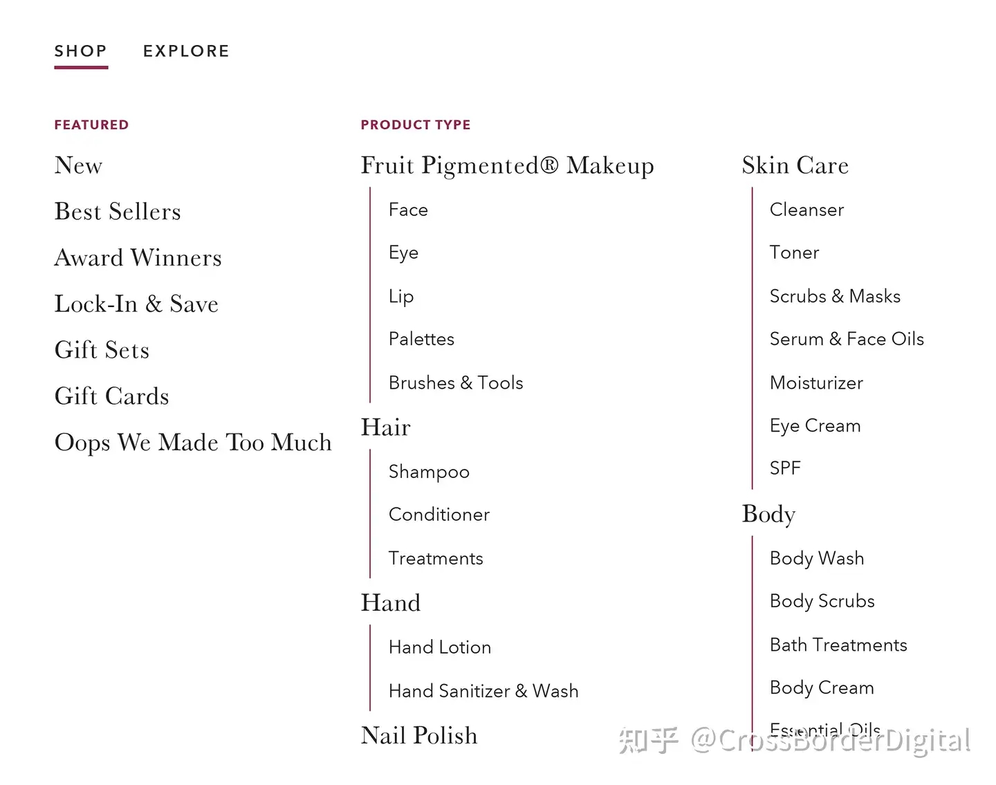 查看首页导航时,你会发现 100percentpure 遵循许多在线商店使用的页面层次结构,例如: