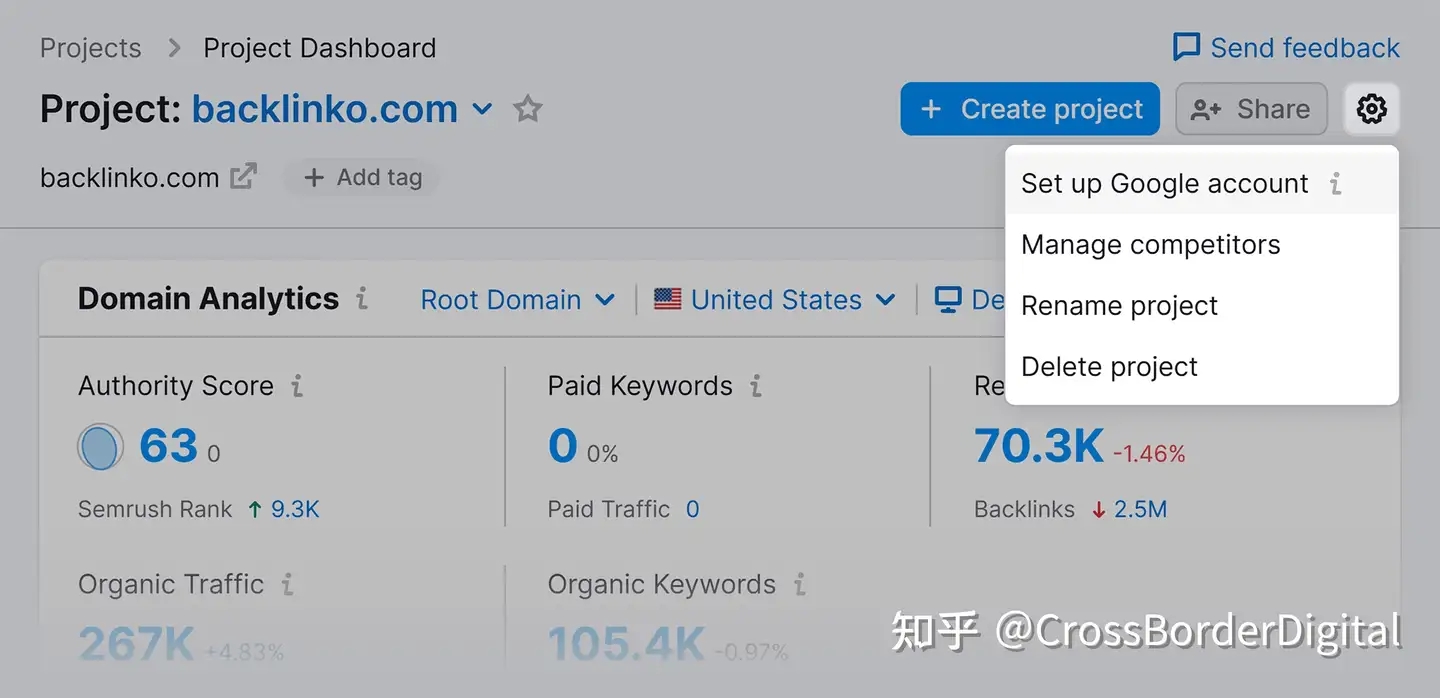 不必每次想监控网站时都在Google Search Console(GSC)和Google Analytics 4(GA4)之间切换。通过设置Semrush项目,你可以获得一个仪表板,其中包含与你的域相关的所有数据。只需前往Semrush的“项目”页面,输入你的域名,并按照说明操作即可。你还可以与其他团队成员、合作者或机构共享这个项目。