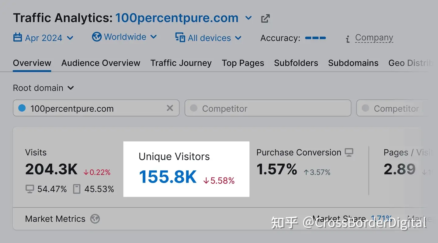 以100percentpure网站为例,这家有机化妆品零售商在2024年4月吸引了155,000名独立访客。这在很大程度上归功于我们将在本文中探讨的SEO策略。