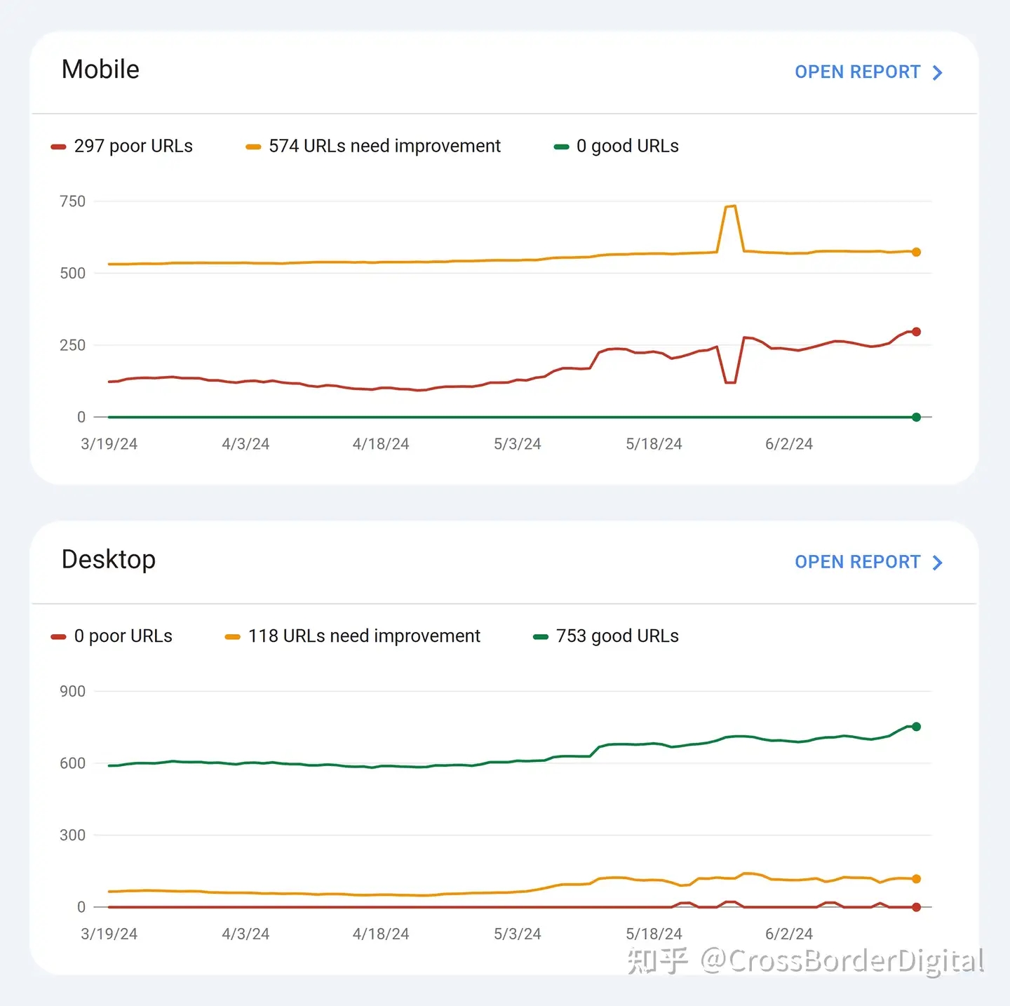 页面速度(或你的网站加载所需的时间)在 2024 年仍然是一个确定的排名因素。它是核心网络生命力的一部分,这是 Google 用来衡量用户体验的一组指标。要在 GSC 中检查这些,请转到“体验”>“核心网络生命力”。你将看到标有“差”、“需要改进”或“好”状态的页面列表。如下所示: