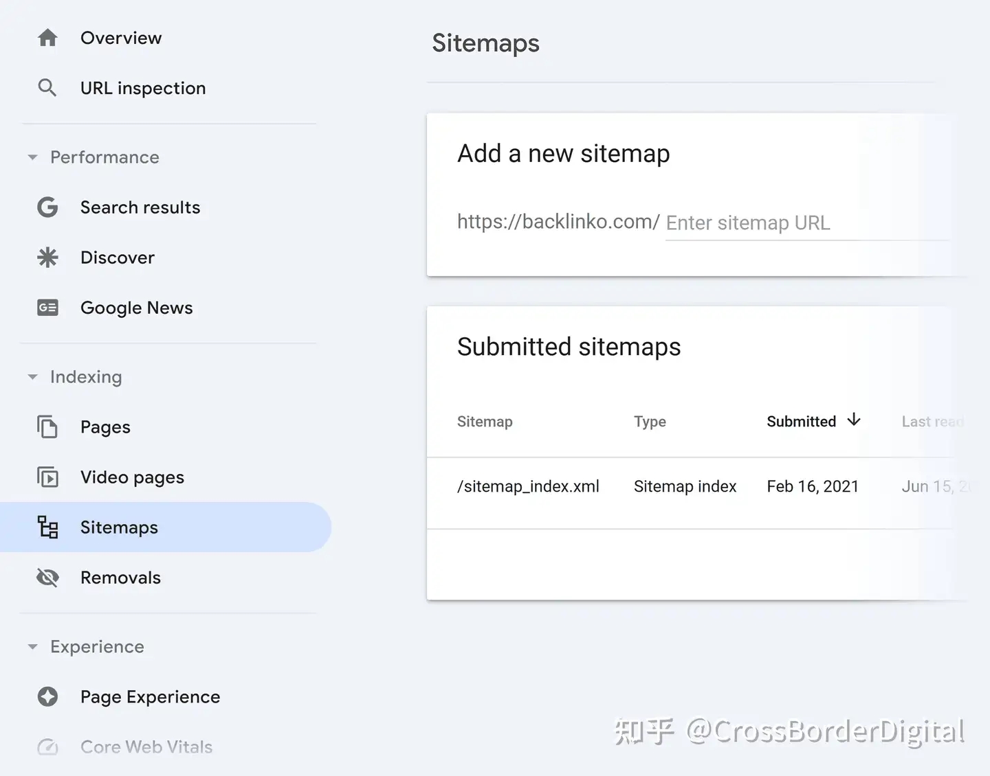 现在让我们转到最有价值的(免费)技术 SEO 工具:Google Search Console 可帮助你检测站点速度、移动优化和站点地图问题。首先在 GSC 上提交你的站点地图。Shopify 会自动生成并更新你的站点地图。因此,你只需将你的站点地图地址(例如 https://example.com/sitemap.xml)复制到 GSC 中的“站点地图”菜单中即可。