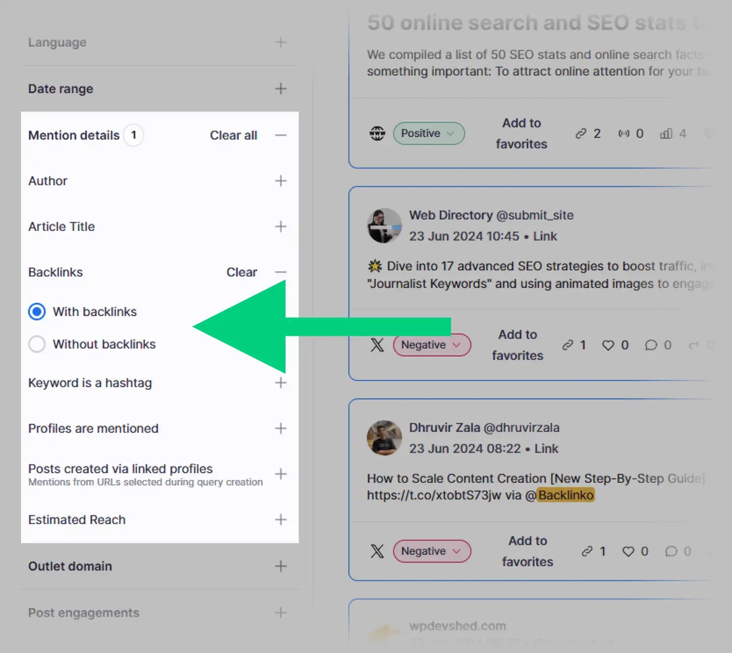 为此,请在品牌监控工具中创建搜索查询。在“跟踪反向链接”部分填写你的反向链接 URL。该工具将开始跟踪你的品牌提及,无论是否有指向你网站的反向链接。然后,你可以在工具中浏览提及时使用“提及详情”>“反向链接”过滤器。