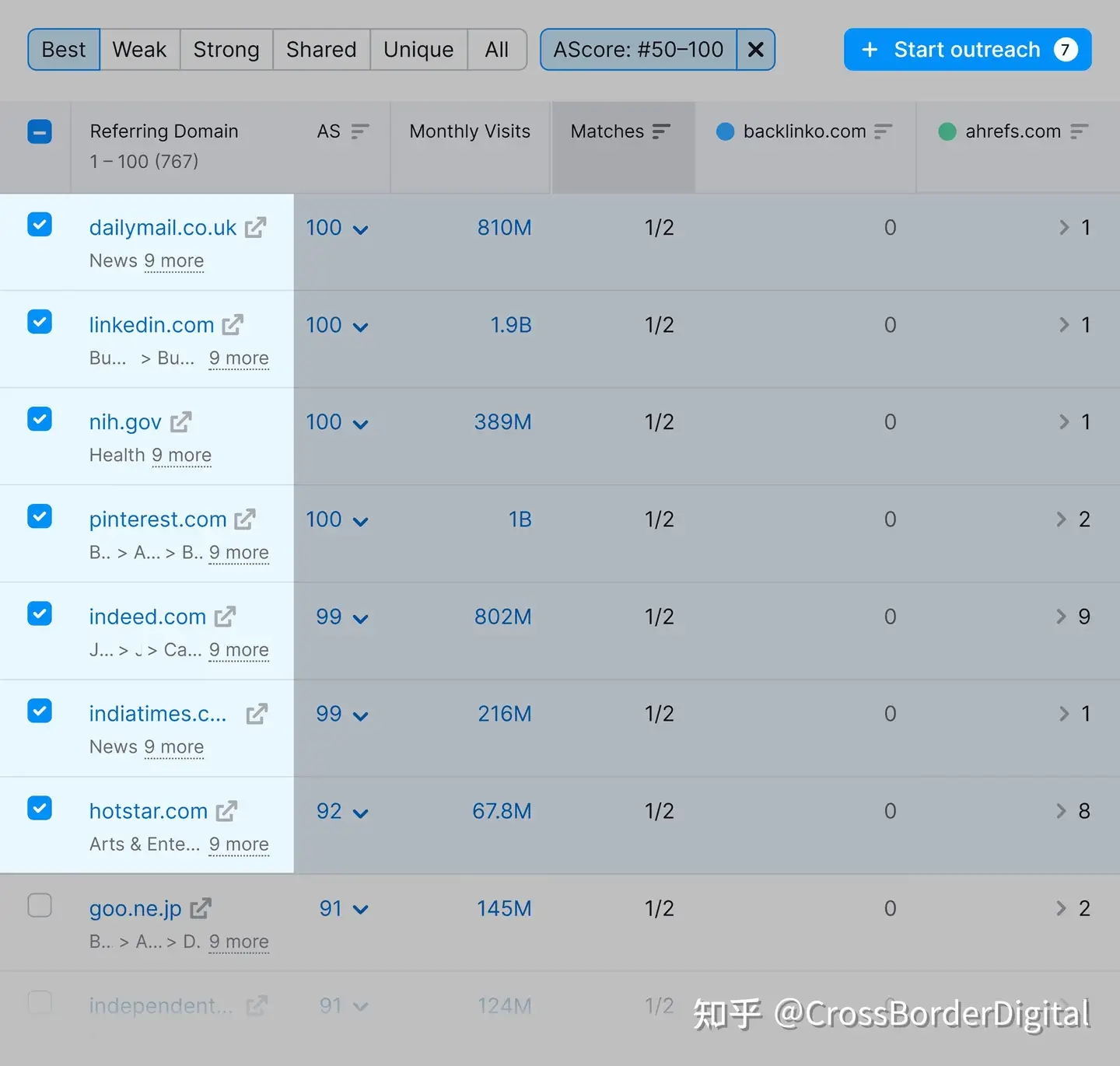 Semrush的反向链接差距工具还支持摩天大楼技术。它能列出链接到竞争对手但未链接到你网站的页面。通过直接联系这些网站,你可以请求他们将链接指向你的内容。