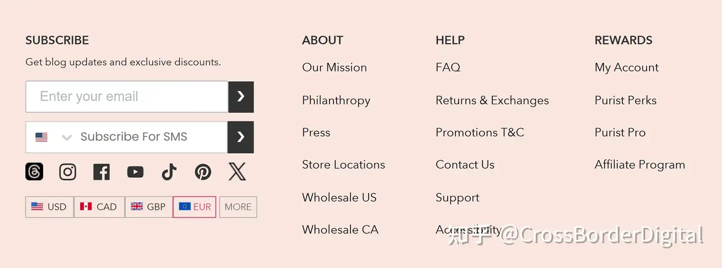 它还利用底部菜单或页脚链接到其他重要页面,如“退货和换货”和“支持”页面。在这些位置,你也可以找到链接到类别页和子类别页的入口。