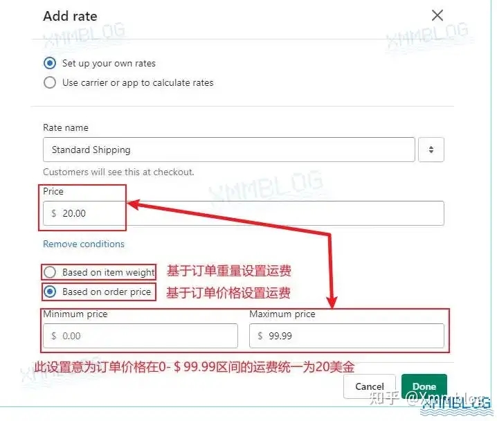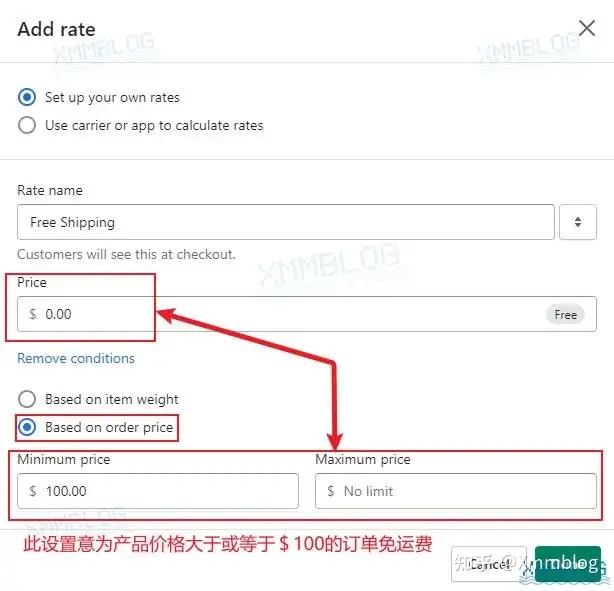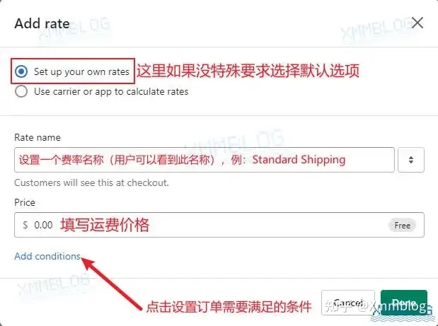 如果你需要为运费设置触发条件,请点击【Add conditions-添加条件】,然后添加相应的运费条件。
