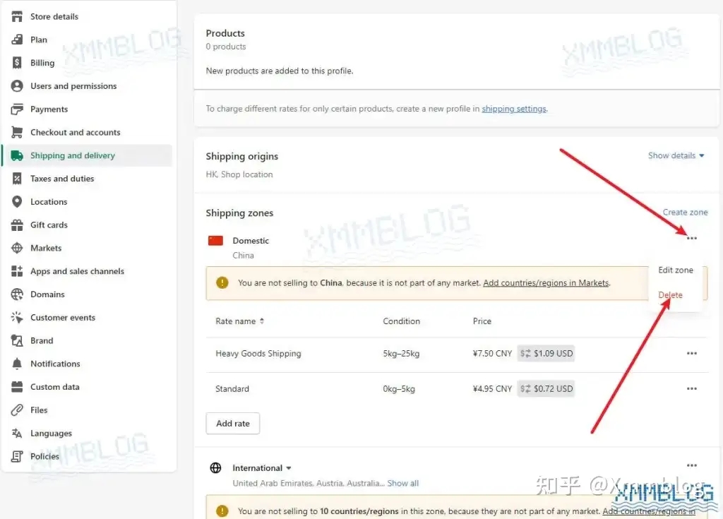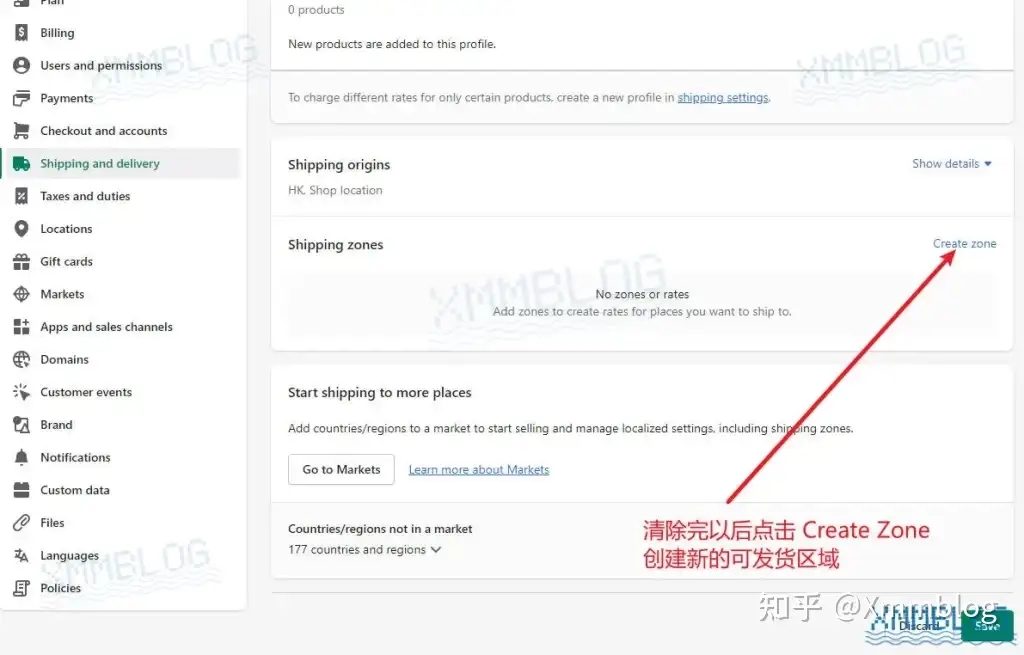 点击【Shipping zones-发货区域】中的【Delete-删除】删除默认的发货区域和运费费率。