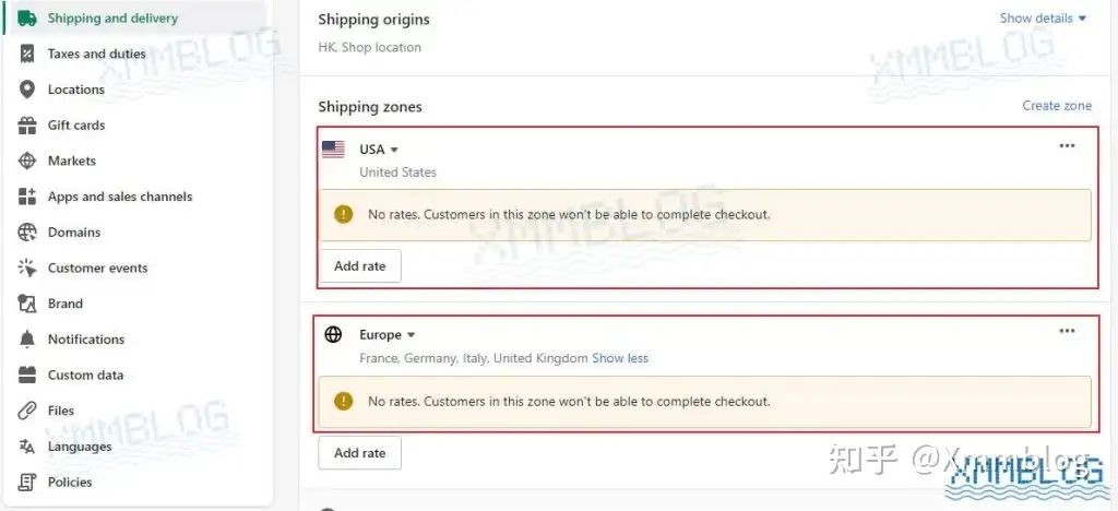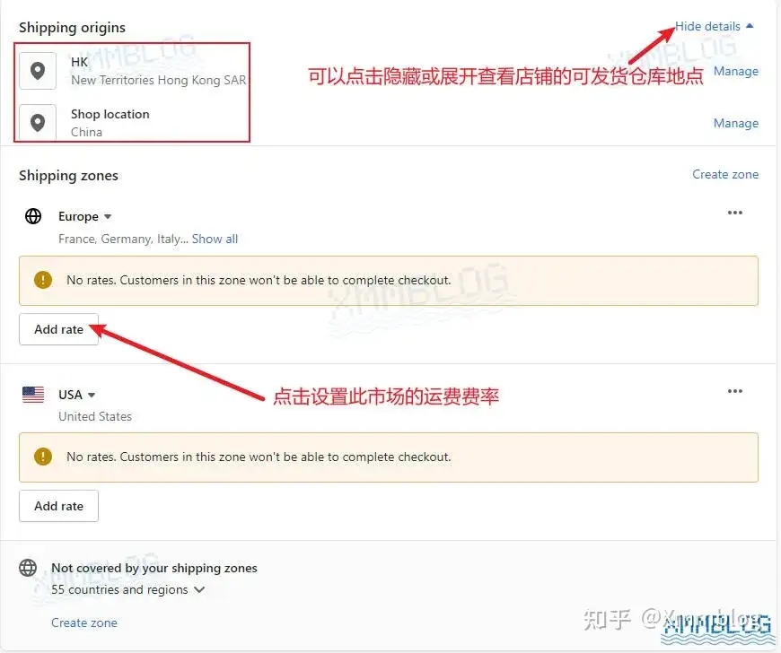 点击【Add rate-添加费率】添加可发货区域的运费费率。