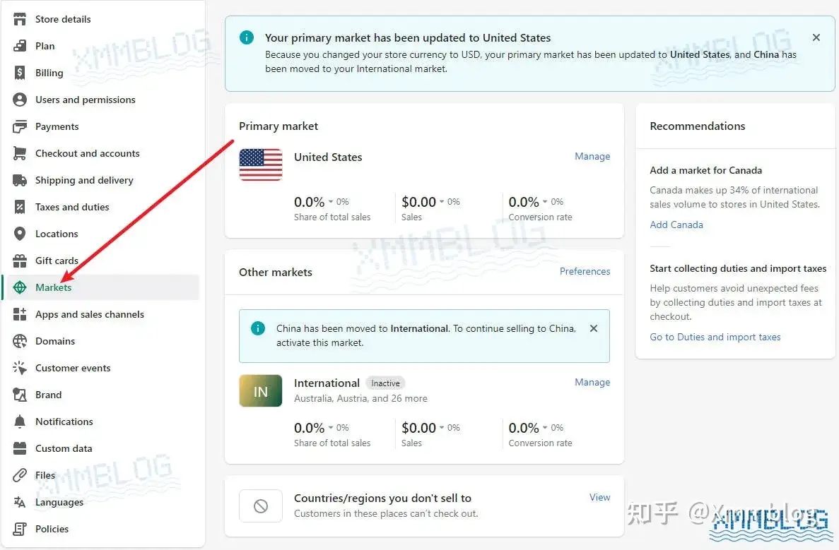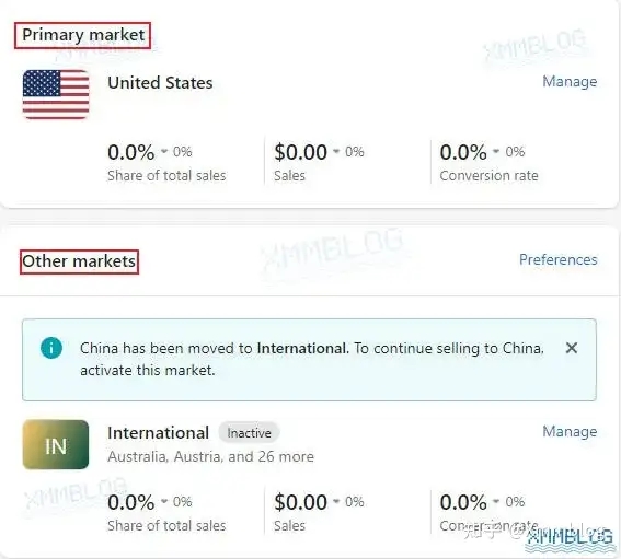 假设你的店铺货币为US dollars(USD),你的主要市场将会被设置为美国,请参阅如何修改Shopify店铺货币完成相关设置。