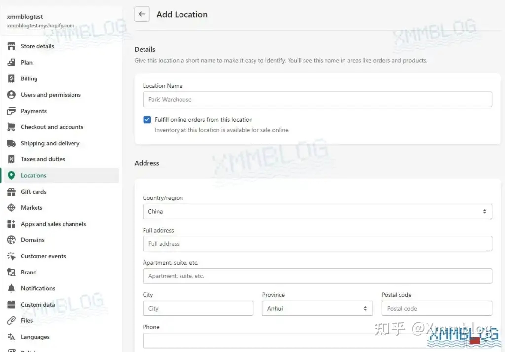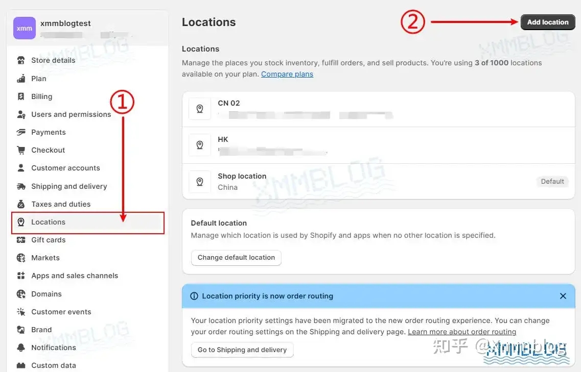 在左侧功能栏中,找到【Locations-地点】并点击右上方的【Add location-添加地点】,为Shopify店铺添加新的发货地点。