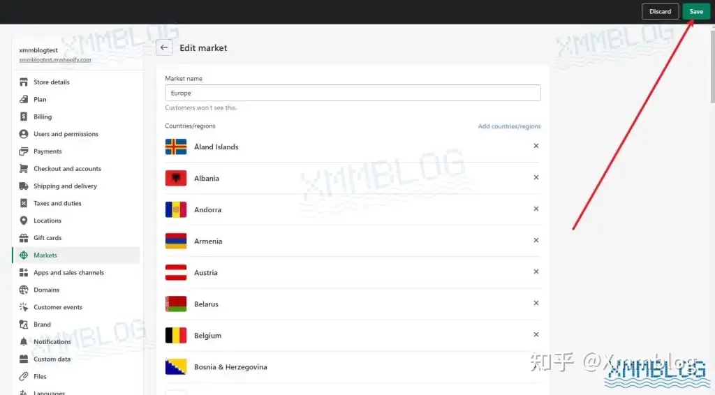 在下面的例子中,创建了一个名为 Europe 的 市场(包括全欧洲所有的国家和地区),完成设置后点击右上角【Save-保存】。
