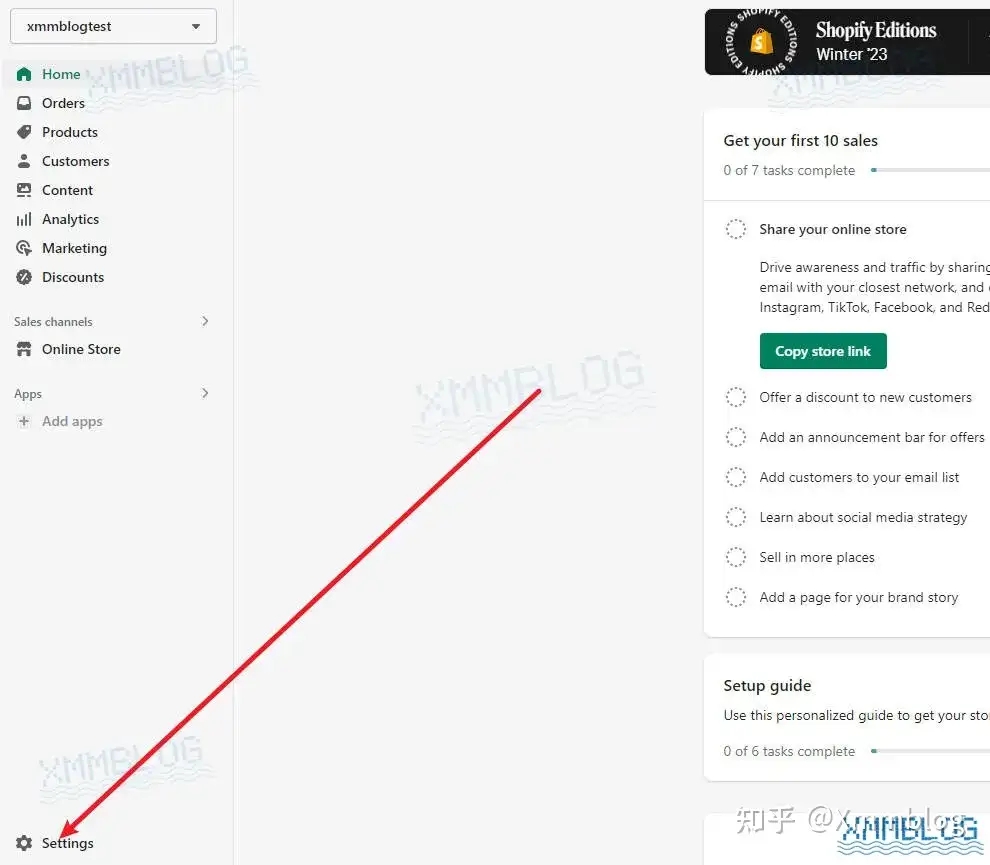 第一步,打开Shopify后台主页,点击左下角【Settings-设置】。