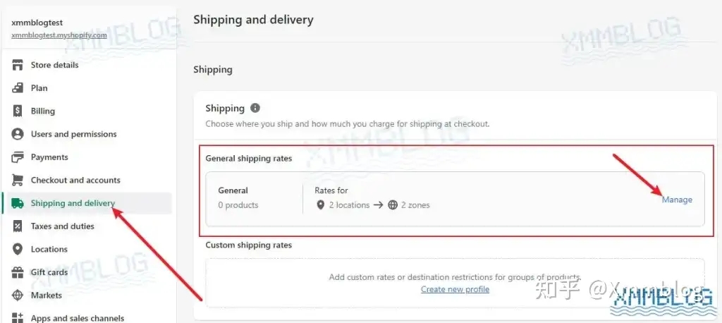 在【Shipping and delivery-发货和配送】中找到【Shipping-发货】,点击【Manage-管理】进入运费设置页面。