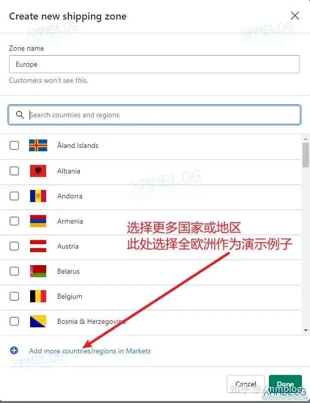 下一步,在下方通过搜索或下拉的方式向该区域添加国家或地区,如下图所示: