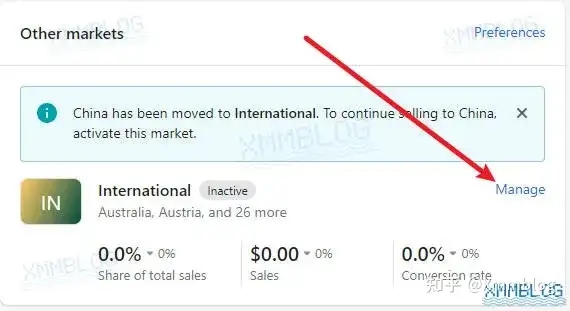 接下来我们修改 其他市场 中的国家或地区,在【Other markets–其他市场】中找到【Manage-管理】并点击。