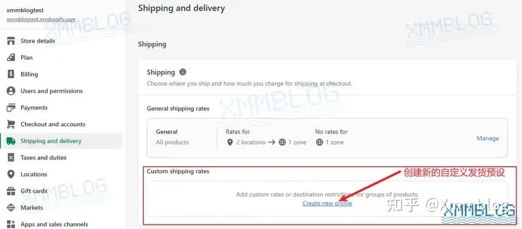 在【Shipping and delivery-发货与配送】中找到【Custom shipping rates-自定义运费】,点击【Create new profile-新建发货预设】创建自定义发货预设。如下图所示: