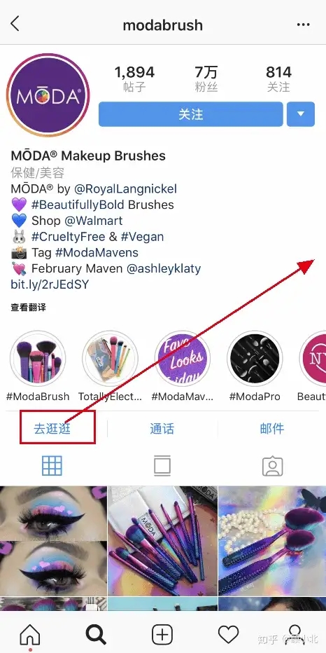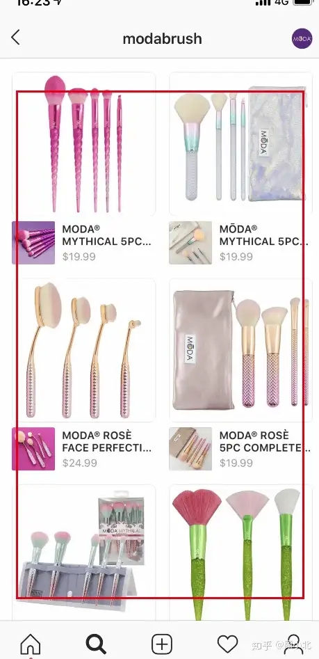 我在网上搜索到一个叫“modabrush”的美妆品牌,点开它的主页就可以看到有一个“shop”(去逛逛)的tab,你可以直接点击这个tab,然后就转到了第二张图片。如图: