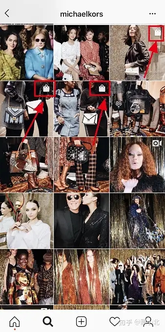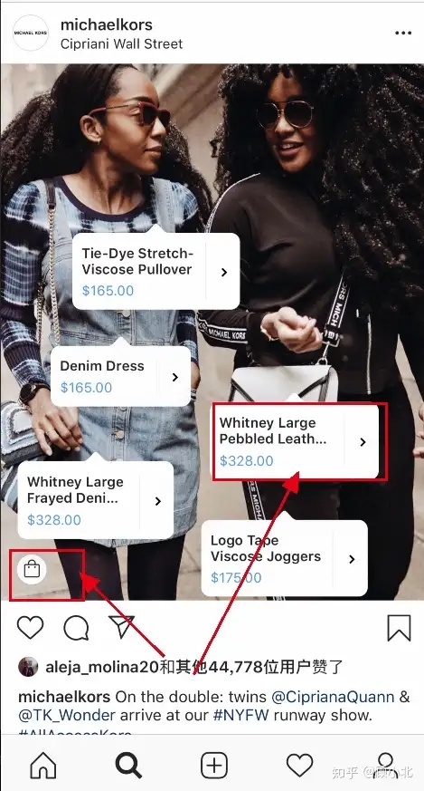 商家在他们发布的post里面会tag出产品,同时图片上有包包一样的小图标,用户看中这个产品的话,可以点击该产品了解详情或者购买。
